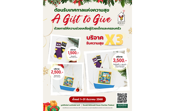 ร่วมเป็นส่วนหนึ่งในการสนับสนุนภารกิจของมูลนิธิโรนัลด์ แมคโดนัลด์ เฮาส์ ประเทศไทย เพื่อช่วยเหลือผู้ป่วยเด็ก และครอบครัวให้ได้อยู่ใกล้กัน กับแคมเปญ ‘A GIFT TO GIVE’ ผ่านการบริจาคได้ที่เทใจดอทคอม (https://taejai.com/th/campaigner/rmhcthailand) ตั้งแต่วันนี้ ถึง 31 ธ.ค. 2568 โดยรายได้หลังหักค่าใช้จ่ายสนับสนุน มูลนิธิโรนัลด์ แมคโดนัลด์ เฮาส์ เพื่อช่วยเหลือผู้ป่วยเด็กและครอบครัวให้ได้อยู่ใกล้กัน สามารถติดตามข้อมูลเพิ่มเติมเกี่ยวกับ มูลนิธิโรนัลด์ แมคโดนัลด์ เฮาส์ ประเทศไทย ได้ที่ FB • IG • TikTok • LINE @rmhcthailand หรือ www.rmhc.or.th