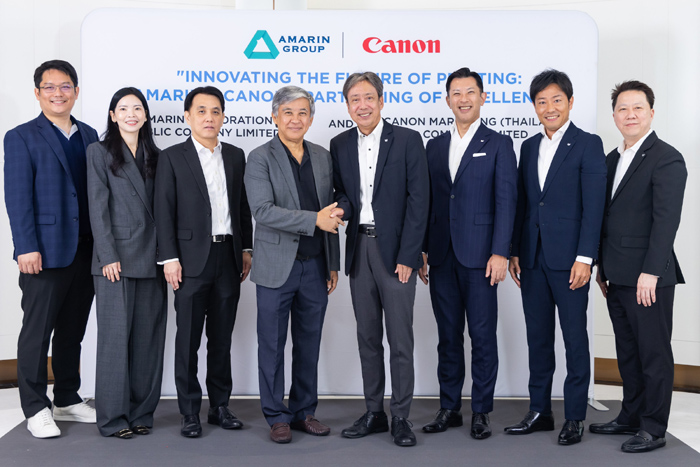 แคนนอน (CANON) ผู้นำด้านเทคโนโลยีอิมเมจจิ้งระดับโลก นำโดยนายฮิโรชิ โยโกตะ (ที่ 5 จากซ้าย) ประธานบริษัทและประธานกรรมการบริหาร และบริษัท อมรินทร์ คอร์เปอเรชั่นส์ จำกัด (มหาชน) ผู้นำด้านการผลิตสื่อและคอนเทนต์ครบวงจรของเมืองไทย โดยนายนรรัตน์ ลิ่มนรรัตน์ (ที่ 4 จากซ้าย) รองประธานคณะกรรมการบริหาร ประกาศความร่วมมือเชิงกลยุทธ์ระยะยาวใน “Strategic Partnership Program” ผสานจุดแข็งด้านเทคโนโลยีการพิมพ์และโซลูชันอิมเมจจิ้งของแคนนอน เข้ากับศักยภาพการผลิตสื่อและแพลตฟอร์มการสื่อสารที่หลากหลายของอมรินทร์ เพื่อร่วมกันยกระดับมาตรฐานอุตสาหกรรมสื่อ ต่อยอดโอกาสทางธุรกิจ และเสริมพลังด้านการตลาดร่วมกันให้ครอบคลุมทั้งช่องทางออนไลน์ ออนกราวนด์ และการจัดอีเวนต์ ประเดิมโครงการแรกโดยทางอมรินทร์เลือกติดตั้งเครื่องพิมพ์ Canon ColorStream 8000 Series เป็นรายแรกในประเทศไทย เพื่อยกระดับประสิทธิภาพการพิมพ์ให้รองรับดีมานด์ตลาดหนังสือยุคใหม่ที่ต้องการทั้งคุณภาพ ความรวดเร็ว ไม่จำกัดจำนวนงานพิมพ์ พร้อมกับอนุรักษ์พลังงานในเวลาเดียวกัน