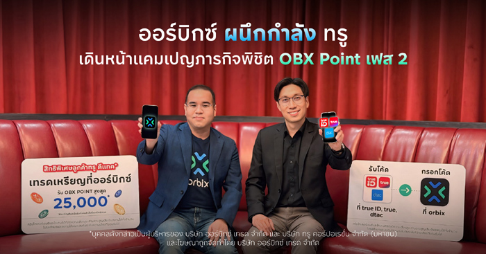 ออร์บิกซ์ เทรด (orbix) สานต่อความสำเร็จโปรแกรมสะสมคะแนน “OBX Point” ผนึกกำลังร่วมกับ ทรู คอร์ปอเรชั่น เปิดตัวแคมเปญภารกิจพิชิต OBX Point เฟส 2 ฉลองสิ้นปี มอบสิทธิพิเศษแก่ลูกค้าทรู-ดีแทคที่มีบัญชีออร์บิกซ์ รับคะแนนสะสม OBX Point สูงสุดถึง 25,000 คะแนน* เพื่อแลกของรางวัลและสิทธิประโยชน์ ต่าง ๆ บนแพลตฟอร์มออร์บิกซ์ได้ตั้งแต่ 1 พฤศจิกายน 2568 – 31 มกราคม 2569
