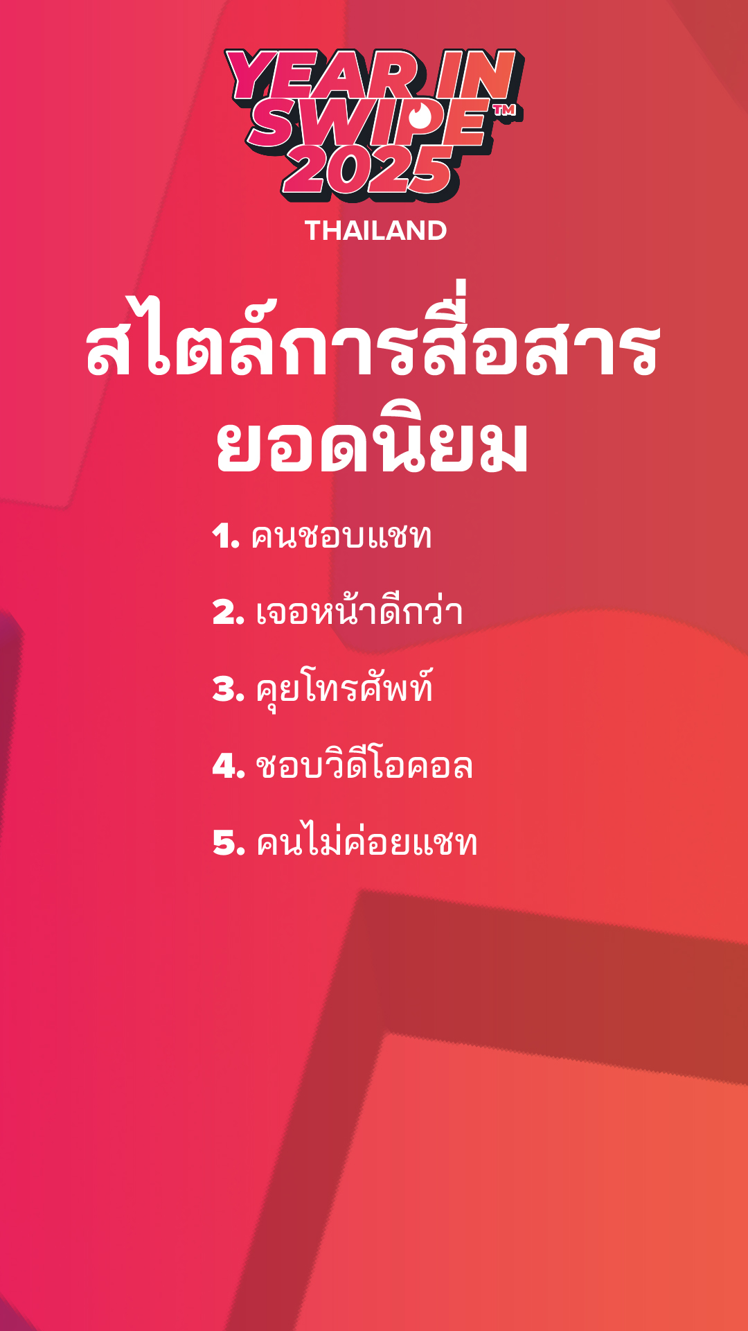 ในปี 2567 เป็นปีที่คนโสดนิวเจนมองหา การออกเดทที่มีจุดมุ่งหมาย มาปี 2568 ถือเป็นปีที่ทุกอย่างกลับสู่ความสงบ คนโสดปรับจังหวะช้าลง เผยตัวตนมากขึ้น และเริ่มสื่อสารว่าต้องการอะไร ซึ่งแนวโน้มดังกล่าวจะยังดำเนินต่อไปในปี 2569 สู่ ปีแห่งความสัมพันธ์ไร้ความคลุมเครือ