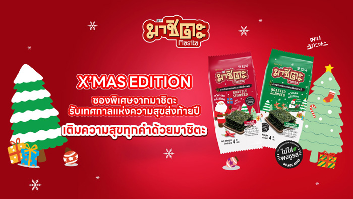 “มาชิตะ” ร่วมส่งโมเมนต์ความสุขปลายปี เปิดตัวแพคเกจจิ้งดีไซน์พิเศษ “X’mas Edition” ต้อนรับเทศกาลวันคริสต์มาสและปีใหม่ โดยดีไซน์พิเศษนี้ถูกสร้างขึ้นภายใต้คอนเซ็ปต์ “ส่งความสุขและเติมเต็มความอร่อยในทุกโมเมนต์” เพื่อให้สาหร่ายมาชิตะเป็นมากกว่าสแน็ค แต่เป็นของขวัญที่ส่งต่อรอยยิ้มและความอบอุ่นในช่วงเทศกาล โดยวางจำหน่ายในรูปแบบลิมิเต็ด เอดิชั่น 2 รสชาติยอดนิยม ได้แก่ สาหร่ายอบสไตล์เกาหลีรสออริจินัล และสไปซี่