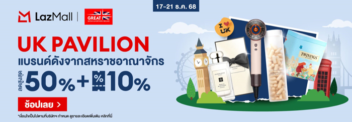สถานเอกอัครราชทูตอังกฤษ สานต่อความร่วมมือกับ ลาซาด้า ในแคมเปญพิเศษ “UK Pavilion – ช้อปแบรนด์ดังจากสหราชอาณาจักร” เติมสีสันรับเทศกาลส่งท้ายปี คัดสรรสินค้าแบรนด์ดังส่งตรงจากสหราชอาณาจักรมากกว่า 7,000 รายการบน LazMall แหล่งรวมสินค้าคุณภาพและแบรนด์ชั้นนำจากทั่วโลก มอบประสบการณ์ช้อปปิงระดับพรีเมียม พร้อมดีลสุดพิเศษและของขวัญสุดเอ็กซ์คลูซีฟ รับฤดูกาลแห่งการเฉลิมฉลอง ระหว่างวันที่ 17–21 ธันวาคม นี้