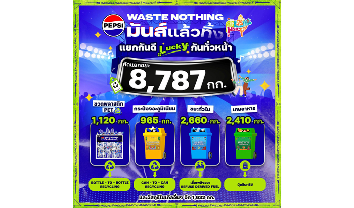 ทุกวันนี้ งานอีเวนต์ในประเทศไทย ไม่ว่าจะเป็นคอนเสิร์ต นิทรรศการ หรือการประชุมสัมมนา ล้วนสร้างขยะจำนวนไม่น้อย ทำให้การจัดการขยะกลายเป็นเรื่องสำคัญที่ผู้จัดงานต้องให้ความใส่ใจมากขึ้น หลายงานเริ่มมีจุดคัดแยกขยะเพื่อชวนผู้ร่วมงานร่วมแยกและทิ้งขยะอย่างรับผิดชอบ ในฐานะบริษัทที่มุ่งมั่นเรื่องการจัดการบรรจุภัณฑ์อย่างยั่งยืน ซันโทรี่ เป๊ปซี่โค ประเทศไทย จึงร่วมมือกับ เป๊ปซี่โค ประเทศไทย ริเริ่มแคมเปญ “Waste Nothing – มันส์ แล้ว ทิ้ง” เพื่อยกระดับการจัดการขยะในเทศกาลดนตรีอย่างจริงจังและเต็มรูปแบบ ถือเป็นหนึ่งในรายแรก ๆ ของประเทศไทยที่ทำอย่างเป็นระบบ ตั้งแต่การคัดแยกขยะต้นทาง ไปจนถึงการส่งต่อวัสดุรีไซเคิลที่แยกได้ไปยังปลายทางที่เหมาะสม แคมเปญนี้ดำเนินการต่อเนื่องในงาน เป๊ปซี่ พรีเซนต์ บิ๊กเมาน์เท่นมิวสิคเฟสติวัล ตั้งแต่ปี 2566 เพื่อสร้างมาตรฐานใหม่ของการจัดงานที่สนุกและรักษ์โลกไปพร้อมกัน