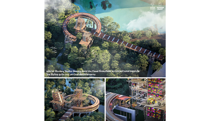 • สาขา Architectural รางวัลชนะเลิศ GOLD AWARD ได้แก่ ธีรภัทร อุปรัง จาก มหาวิทยาลัยมหาสารคาม กับผลงาน Monkey Shelter Beauty Amid the Flood ที่หลบภัยลิง ความงามท่ามกลางอุทกภัย นี้ได้แรงบันดาลใจจากปัญหาอุทกภัยที่วนอุทยานโกสัมพี จ.มหาสารคาม โครงการถูกออกแบบขึ้นเพื่อช่วยเหลือลิงแสมขนสีทองและลิงแสมขนสีเทารวมกว่า 700–800 ตัวที่ประสบปัญหาน้ำท่วมที่อยู่อาศัย และขาดแคลนอาหารในทุกๆ ฤดูฝนเพราะนักท่องเที่ยวไม่สามารถเข้าไปให้อาหารลิงได้ ที่หลบภัยดังกล่าวถูกออกแบบเป็นอาคารทรงกลม ยกพื้นสูงเพื่อรองรับสถานการณ์น้ำท่วม และดีไซน์ให้นักท่องเที่ยวส่งอาหารให้ลิงได้อย่างปลอดภัย