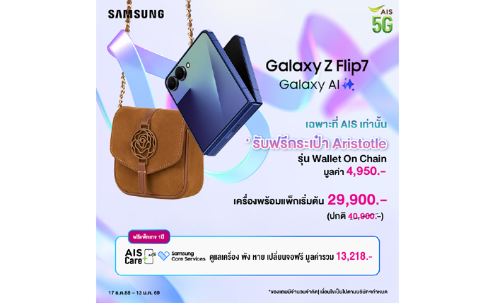 AIS ร่วมกับซัมซุง ผู้ผลิตสมาร์ทโฟนรายใหญ่ของโลก จัดโปรส่งความสุขท้ายปี 2025 พร้อมยกระดับสมาร์ทโฟน สู่แฟชั่นไอเทมสุดหรู เพียงซื้อสมาร์ทโฟนเรือธงระดับไฮเอนด์ที่ได้รับความนิยม Samsung Galaxy Z Flip7 รับฟรี! กระเป๋า Aristotle รุ่น Wallet on Chain หนัง Suede สีพิเศษ Light Brown มูลค่า 4,950 บาท ของขวัญสุดลิมิเต็ด เฉพาะลูกค้า AIS เท่านั้น กระเป๋าแฟชั่นแบรนด์ดังที่ใครๆ ก็อยากเป็นเจ้าของ รองรับการใช้งานได้ถึง 4 สไตล์ ทั้งสะพายข้าง, สะพายครอสบอดี้, คาดเอว หรือจะถือแบบเก๋ๆ แถมยังมีพื้นที่สำหรับใส่บัตร, เงิน และสมาร์ทโฟน Galaxy Z Flip7 ด้วยดีไซน์สุดชิค ทำให้แมทช์กับลุคของสมาร์ทโฟนพรีเมียมได้อย่างลงตัว ให้ลูกค้าได้อัปเลเวลทั้งไลฟ์สไตล์แฟชั่น และประสบการณ์การใช้งานบนเครือข่าย AIS 5G ที่เร็ว แรง และเสถียรยิ่งขึ้น