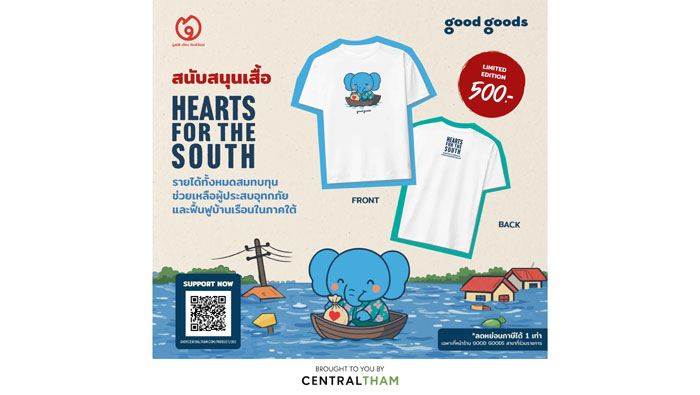 ทั้งนี้ ผู้ร่วมสนับสนุนทุกๆ 500 บาทจะได้รับเสื้อยืด “Hearts For The South” 1 ตัวจากกุ๊ด กุ๊ดส์เพื่อเป็นสัญลักษณ์แห่งการแบ่งปันและการมีส่วนร่วมในการช่วยเหลือสังคม ทั้งนี้รายได้จากการสนับสนุนทั้งหมดไม่หักค่าใช้จ่าย จะมอบให้แก่มูลนิธิเตียง จิราธิวัฒน์ เพื่อนำไปจัดซื้อสิ่งจำเป็นและสนับสนุนการฟื้นฟูพื้นที่ประสบอุทกภัยหลัง น้ำลด