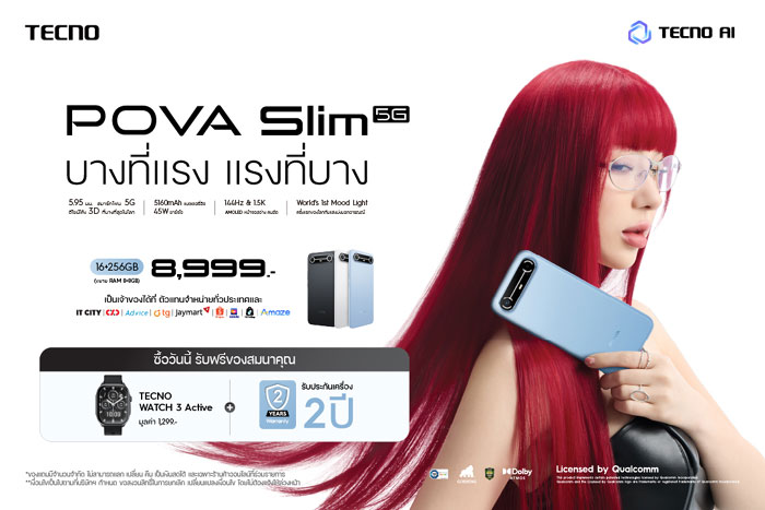 TECNO แบรนด์เทคโนโลยีนวัตกรรมที่ขับเคลื่อนด้วย AI ประกาศเปิดตัวนวัตกรรมล่าสุดในซีรีส์ POVA อย่างเป็นทางการ ได้แก่ TECNO POVA Slim 5G สมาร์ตโฟน 5G 3D Curved ที่บางที่สุดในโลก เพียง 5.95 มม.และแบตเตอรี่ความจุ 5,160mAh รองรับชาร์จเร็ว 45W ผสานดีไซน์บางเฉียบเข้ากับพลังการใช้งานที่ยาวนานได้อย่างลงตัว ภายใต้คอนเซ็ปต์ บางที่แรง แรงที่บาง ยกระดับการผสานสไตล์แห่งอนาคตและประสิทธิภาพที่แข็งแกร่ง เพื่อตอบโจทย์ไลฟ์สไตล์ของคนรุ่นถัดไปในทุกมิติของชีวิตประจำวัน พร้อมกันนี้ TECNO ยังได้เปิดตัว “พลอยชมพู ญานนีน ภารวี ไวเกล” สะท้อนถึง พลัง ความมั่นใจ และความคิดสร้างสรรค์ ซึ่งสอดคล้องกับคอนเซ็ปต์ของ TECNO POVA Slim 5G ได้อย่างลงตัว