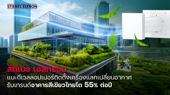 สตีเบล เอลทรอน (Stiebel Eltron) ผู้นำด้านนวัตกรรมอำนวยความสะดวกจากประเทศเยอรมนี ชี้อาคารสีเขียวในประเทศไทยมีการขยายตัวอย่างรวดเร็ว จากกระแสการพัฒนาเมืองเพื่อความยั่งยืนทางสิ่งแวดล้อม ประกอบกับความตื่นตัวในการดูแลสุขภาพของผู้บริโภค จึงแนะนำอาคารและโครงการอสังหาริมทรัพย์ติดตั้งเครื่องแลกเปลี่ยนอากาศรุ่น VLR 70 S ที่ช่วยลดความอับชื้นและเพิ่มการหมุนเวียนของอากาศบริสุทธิ์ภายในห้อง พร้อมกรองมลภาวะและสารก่อภูมิแพ้ในอากาศได้อย่างมีประสิทธิภาพ เพื่อให้สอดรับกับเกณฑ์ด้านคุณภาพอากาศตามมาตรฐานอาคารสีเขียว พร้อมยกระดับสุขภาวะของผู้ที่อยู่ในอาคารอย่างครบวงจร