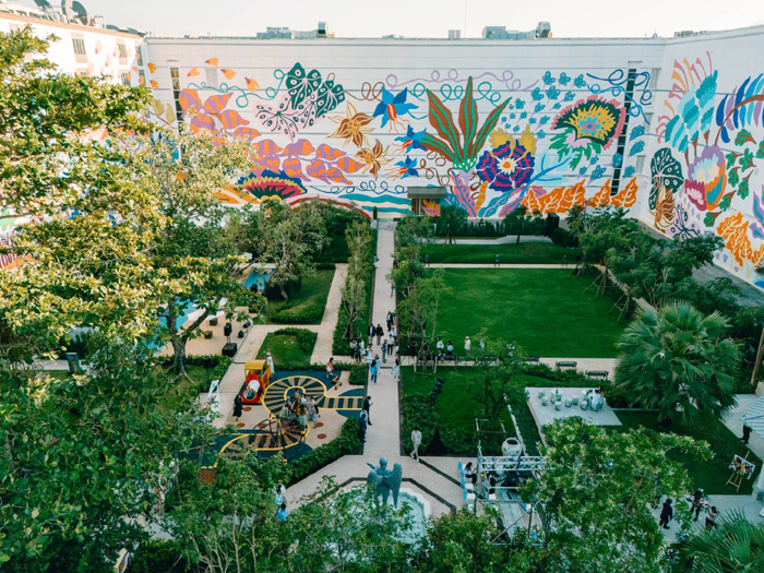 1) กำแพงพฤกษา “The Wall” ผลงานของ นุ่น นววรรณ โตวิเศษ กับศิลปะภาพวาดบนฝาผนัง Mural Art ขนาดกว่า 3,000 ตารางเมตร ถ่ายทอดความงามของพรรณไม้เลื้อยและระบบนิเวศแห่งจินตนาการราวกับมีชีวิต ลวดลายพืชพันธุ์ที่พลิ้วไหวดั่งกำลังเต้นตามสายลม นำเสนอสีสันอันสดใสที่ช่วยปลุกพลังบวกและสร้างสุนทรียะใหม่ให้กับสถาปัตยกรรมและพื้นที่สวน นับเป็นอีกหนึ่งองค์ประกอบที่ทำให้พื้นที่แห่งนี้โดดเด่นและมีเอกลักษณ์เฉพาะตัว