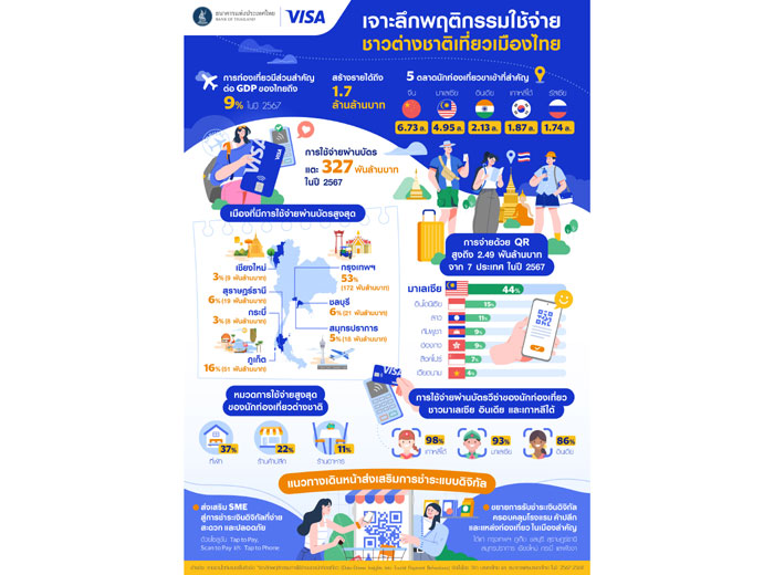 ธนาคารแห่งประเทศไทยร่วมกับวีซ่า ประเทศไทย ออกรายงาน “เจาะลึกพฤติกรรมการชำระเงินของนักท่องเที่ยวด้วยข้อมูล (Data-Driven Insights into Tourist Payment Behaviours)” ซึ่งนำเสนอการวิเคราะห์เกี่ยวกับการใช้จ่ายและแนวโน้มการชำระเงินของนักท่องเที่ยวต่างชาติ ที่จะเปลี่ยนมุมมองต่ออุตสาหกรรมท่องเที่ยวและการชำระเงินของไทย ความร่วมมือนี้สะท้อนถึงความมุ่งมั่นร่วมกันในการเร่งการเปลี่ยนผ่านสู่ดิจิทัลของประเทศไทย และเสริมความแข็งแกร่งให้ประเทศไทยก้าวสู่การเป็นจุดหมายปลายทางท่องเที่ยวระดับโลกที่ทันสมัยและไร้รอยต่อ