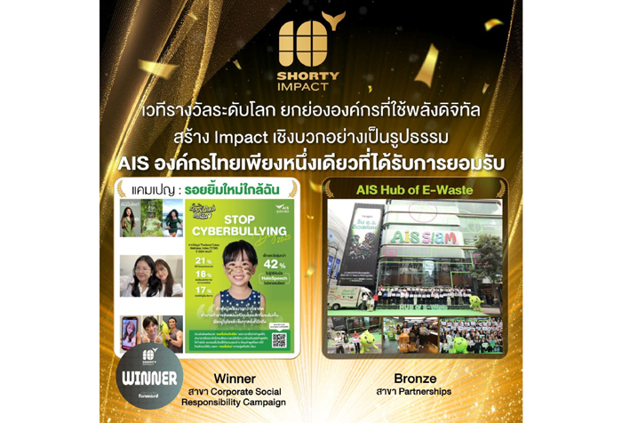 ความสำเร็จครั้งนี้สะท้อนความมุ่งมั่นของเอไอเอสในการดำเนินธุรกิจตามแนวคิด ESG โดยนำเทคโนโลยีดิจิทัลมาเป็นกลไกสำคัญในการขับเคลื่อนแคมเปญเพื่อสังคมอย่างต่อเนื่อง ผ่านโซเชียลมีเดีย ดิจิทัลคอนเทนต์ และนวัตกรรมออนไลน์ เพื่อสร้างการมีส่วนร่วมจากประชาชนและพันธมิตรหลากหลายภาคส่วน ร่วมกันขยายผลลัพธ์เชิงบวกในวงกว้าง ครอบคลุมทั้งมิติความปลอดภัยบนโลกออนไลน์ การดูแลสิ่งแวดล้อม และการสร้างโอกาสทางดิจิทัลอย่างทั่วถึงและยั่งยืน โดยเอไอเอสเป็นองค์กรจากประเทศไทยเพียงรายเดียวที่ได้รับรางวัลจากเวที 10th Annual Shorty Impact Awards 2025 ด้วยผลงานแคมเปญ “รอยยิ้มใหม่ใกล้ฉัน” ภายใต้โครงการอุ่นใจไซเบอร์ ที่ได้รับรางวัลระดับ Winner สาขา Corporate Social Responsibility Campaign และผลงาน AIS Hub of E-Waste ภายใต้โครงการ คนไทยไร้ E-Waste ที่ได้รับรางวัลระดับ Bronze สาขา Partnerships