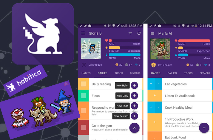 - Habitica: แอปฯ นี้เปลี่ยนรายการสิ่งที่ต้องทำ (To-Do List) ให้เป็นเกม RPG ถ้าคุณทำงานสำเร็จ ตัวละครของคุณจะได้ค่าพลังและเลเวลเพิ่มขึ้น แต่ถ้าผัดวันประกันพรุ่ง พลังชีวิตก็จะลดลง เพื่อช่วยให้มีแรงจูงใจทำเป้าหมายเล็ก ๆ ในแต่ละวัน