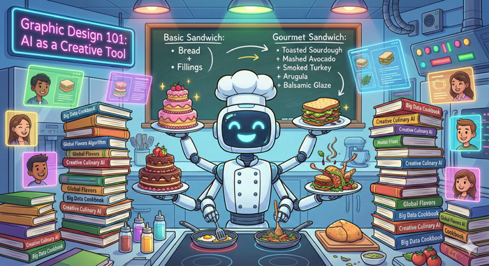 ตัวอย่างพรอมต์: สำหรับคลาสเรียน [นักศึกษากราฟิกดีไซน์ ปี 1] สร้างภาพประกอบสไตล์การ์ตูนที่ดูสนุกสนาน โดยนำเสนอ AI ในรูปแบบของเชฟที่ดูเป็นมิตรและมีชีวิตชีวา อยู่ในห้องครัวแห่งอนาคต ตัวเชฟถูกล้อมรอบด้วยกองหนังสือสูตรอาหารจำนวนมหาศาล [สื่อถึง Data] และมีแขนกลหลายข้างกำลังทำตามคำสั่งอันซับซ้อนอย่างมีประสิทธิภาพ เพื่อสร้างสรรค์อาหารที่สมบูรณ์แบบ [สื่อถึง Outputs] ที่กระดานดำด้านหลัง ให้วาด ‘สูตรอาหาร’ เริ่มต้นแบบง่ายๆ [เช่น การทำแซนด์วิช: ขนมปัง + ไส้] และวางคู่กับ สูตรอาหารที่ซับซ้อนและละเอียดกว่าเดิม [เช่น แซนด์วิชสูตรกูร์เมต์: ขนมปังซาวโดวจ์ปิ้ง + อะโวคาโดบด + ไก่งวงรมควัน + ผักร็อกเก็ต + ซอสบัลซามิก] เพื่อแสดงให้เห็นว่าความรู้และความสามารถของเชฟ AI นั้นขยายตัวและพัฒนาขึ้นอย่างไร โทนภาพโดยรวมควรดู สดใส สนุกสนาน และสื่อให้เห็นว่า AI เป็นเครื่องมือที่ทรงพลังแต่เข้าใจได้ง่าย ในการทำตามคำสั่งและการเรียนรู้