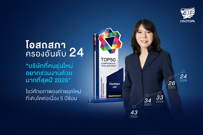 โอสถสภา ตอกย้ำความเชื่อมั่นในฐานะองค์กรที่คนทำงานรุ่นใหม่ให้ความสำคัญ ล่าสุดขยับขึ้นสู่อันดับที่ 24 จากการสำรวจ “Top 50 Companies in Thailand 2026″ โดย WorkVenture ซึ่งรวบรวมความคิดเห็นจากคนทำงานอายุ 22-35 ปี กว่า 12,000 คนทั่วประเทศ ความสำเร็จในปีนี้สะท้อนถึงพัฒนาการที่โดดเด่นและมั่นคง โดยอันดับของโอสถสภาขยับสูงขึ้นอย่างต่อเนื่องตลอด 5 ปีที่ผ่านมา จากอันดับที่ 43 ในปี 2022 สู่อันดับที่ 24 ในปัจจุบัน ความสำเร็จนี้เป็นผลจากการปฏิรูปองค์กร (Enterprise Transformation) ที่ผสานการใช้เทคโนโลยีดิจิทัลเข้ากับวัฒนธรรมองค์กร ‘ACT – The Way We Work’ ซึ่งเป็นเข็มทิศหลักในการขับเคลื่อนพลังคนทำงานและเปิดโอกาสให้พนักงานทุกระดับโชว์ศักยภาพได้อย่างไร้ขีดจำกัด สร้างความรู้สึกเป็นเจ้าของร่วมกัน (Sense of Ownership) ภายใต้วิสัยทัศน์การสร้าง ‘คุณค่าร่วมกัน’ (Shared Value) เพื่อให้พนักงานและองค์กรเติบโตอย่างแข็งแกร่งและยั่งยืนไปพร้อมกัน