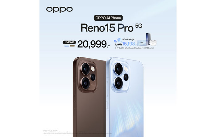 OPPO ประกาศวางจำหน่าย “OPPO Reno15 Series 5G” สมาร์ตโฟนเพื่อนซี้ เทรนดี้ทุกช็อต รุ่นใหม่ล่าสุด วางจำหน่ายในราคาสุดคุ้ม เริ่มต้นเพียง 11,999 บาท มาพร้อมโปรโมชั่นสุดพิเศษในช่วงวันนี้ – 28 กุมภาพันธ์ 2569 อีกทั้งยังมอบทุกประสบการณ์การใช้งานด้วย 2 ผลิตภัณฑ์ IoT ใหม่ อย่าง OPPO Watch S วางจำหน่ายในราคาเริ่มต้น 5,999 บาท และ OPPO Pad 5 ในราคาเริ่มต้น 13,999 บาท