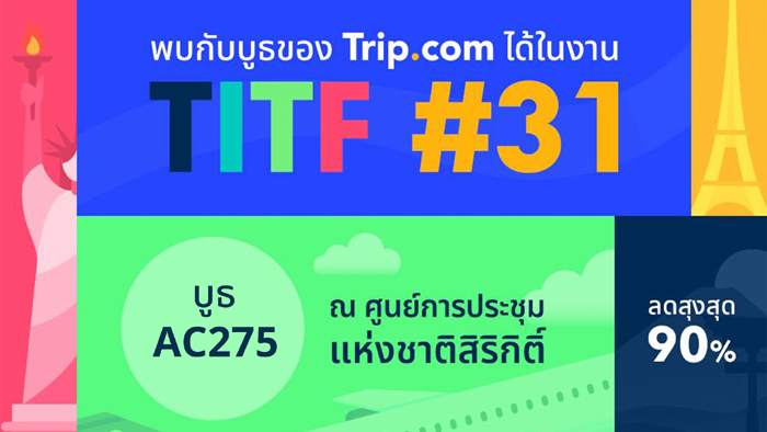Trip.com Thailand แพลตฟอร์มท่องเที่ยวครบวงจรระดับโลก เดินหน้ากระตุ้นตลาดท่องเที่ยวต้นปี 2569 เข้าร่วมงานมหกรรมท่องเที่ยว “TITF31 เที่ยวทั่วไทย ไปทั่วโลก ครั้งที่ 31” ระหว่างวันที่ 22–25 มกราคม 2569 เวลา 10.00 – 20.00 น. ณ ศูนย์การประชุมแห่งชาติสิริกิติ์ ฮอลล์ 5-6 พร้อมอัดโปรโมชันพิเศษเฉพาะในงาน ทั้งตั๋วเครื่องบิน ที่พัก แพ็กเกจทัวร์ รถเช่า ล่องเรือสำราญ และตั๋วเข้าสถานที่ท่องเที่ยว ครอบคลุมทั้งในประเทศและต่างประเทศ