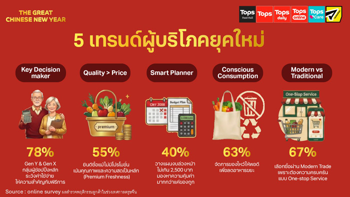และในปีนี้ท็อปส์ยังพบเทรนด์พฤติกรรมผู้บริโภคช่วงตรุษจีนที่น่าสนใจจากการจัดทำผลสำรวจอินไซต์แนวโน้มการ จับจ่ายช่วงเทศกาลตรุษจีนปี 2569 ของลูกค้าท็อปส์ ผ่านช่องทาง LINE TOPS Thailand และ Personal Shopper พบว่า
