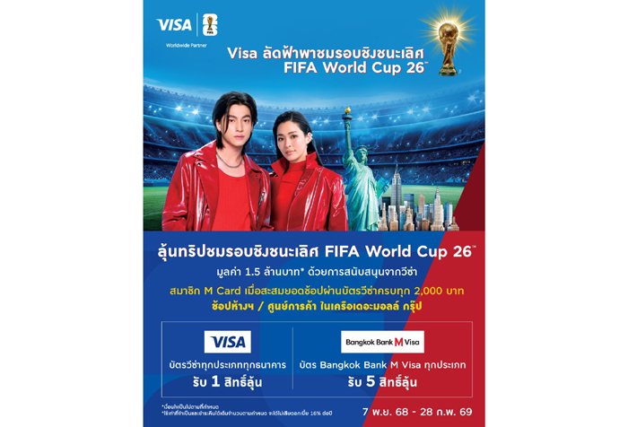 เดอะมอลล์ กรุ๊ป จับมือพันธมิตรระดับเวิลด์คลาส วีซ่า ผู้นำการให้บริการการชำระเงินดิจิทัลระดับโลก และผู้สนับสนุนอย่างเป็นทางการ FIFA WORLD CUP 26™ ที่ประเทศสหรัฐอเมริกา จัดแคมเปญ “M Card ลุ้นทริปชมรอบชิงชนะเลิศ FIFA WORLD CUP 26™” มอบประสบการณ์ครั้งประวัติศาสตร์ ลุ้นทริปชมและเชียร์ฟุตบอลโลกรอบชิงชนะเลิศ ติดขอบสนาม เพียงช้อปสินค้าภายในห้างสรรพสินค้า และศูนย์การค้าเครือเดอะมอลล์ กรุ๊ป สะสมยอดใช้จ่ายผ่านบัตรวีซ่า ทุกประเภทครบทุก 2,000 บาท รับสิทธิ์ลุ้น 1 สิทธิ์ ทริปชมรอบชิงชนะเลิศ FIFA WORLD CUP 26 ™ ที่ประเทศสหรัฐอเมริกา มูลค่า 1.5 ล้านบาท พิเศษเฉพาะผู้ถือบัตร Bangkok Bank M Visa ทุกประเภทรับ 5 สิทธิ์ลุ้น ตั้งแต่วันนี้ – 28 กุมภาพันธ์ 2569 ที่ ห้างสรรพสินค้าเครือเดอะมอลล์ กรุ๊ป และศูนย์การค้าเดอะมอลล์ไลฟ์สโตร์ ทุกสาขา และเดอะมอลล์ โคราช