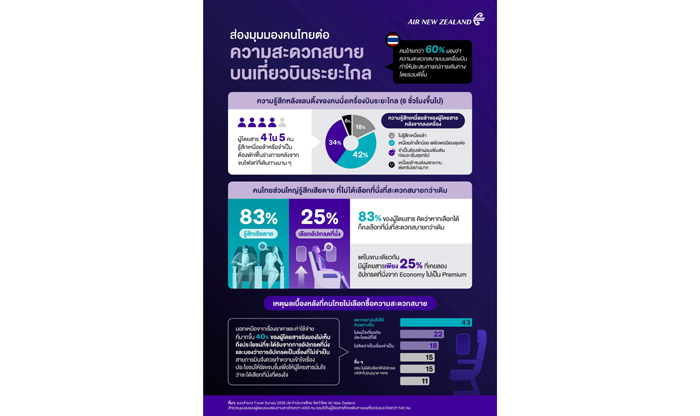 Air New Zealand เปิดเผยผลการวิจัยจากกลุ่มตัวอย่างชาวไทยกว่า 4,000 คนว่า ปัจจุบันความสะดวกสบาย ถือเป็นหนึ่งในเกณฑ์สำคัญที่นักเดินทางให้ความสำคัญไม่ต่างจากราคา เมื่อพิจารณาจองเที่ยวบินระยะไกล