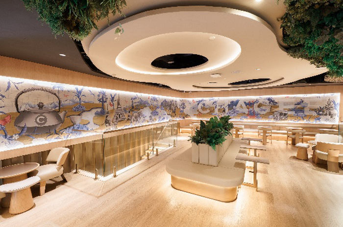 เมื่อก้าวเข้าสู่แฟลกชิปสโตร์ จะได้พบกับการออกแบบพื้นที่ด้านหน้าที่ประดับด้วยม่านโซ่สีทองที่โดดเด่นสะดุดตา ซึ่งได้กลายเป็นมุมถ่ายภาพสุดปังให้กับทุกคนตั้งแต่แรกเห็น พร้อมเติมเต็มบรรยากาศให้แตกต่างด้วยผลงานภาพวาดที่สร้างสรรค์ขึ้นร่วมกับศิลปินไทยอย่าง Pomme Chan (ปอม ชาน) ที่คร่ำหวอดอยู่ในวงการศิลปะโดยเฉพาะการสร้างสรรค์งานภาพประกอบมามากกว่า 20 ปี โดยผลงานบนผนังภายในร้านถ่ายทอดเรื่องราวการเดินทางของชาผ่านกาลเวลาและวัฒนธรรมที่หลากหลาย ผสานภาพภูมิทัศน์ สัญลักษณ์ และช่วงเวลาในชีวิตประจำวันเข้าไว้ด้วยกันอย่างลงตัว เส้นกริดในภาพช่วยนำสายตาให้ไหลไปตามเส้นทางการค้าและชีวิตของผู้คน พร้อมกับสอดแทรกลวดลายไทยร่วมสมัยและเป็นเอกลักษณ์ไว้ในภาพได้อย่างกลมกลืน ผลงานศิลปะชิ้นนี้จึงเป็นการหลอมรวมความงดงามของขนบธรรมเนียมดั้งเดิมเข้ากับวิถีชีวิตสมัยใหม่ได้อย่างลงตัว พร้อมสะท้อนพลังและเสน่ห์ของ “ชา” ที่เชื่อมโยงผู้คน สถานที่ และเรื่องราวต่าง ๆ เข้าไว้ด้วยกันอย่างงดงาม