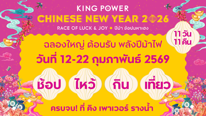 ร่วมเฉลิมฉลองเทศกาลตรุษจีนในงาน KING POWER CHINESE NEW YEAR 2026 RACE OF LUCK & JOY ปีม้า ช้อปมหาเฮง ตั้งแต่วันที่ 12 – 22 กุมภาพันธ์ 2569 ที่ คิง เพาเวอร์ รางน้ำ และภูเก็ต นอกจากนี้ ลูกค้าทุกท่านยังสามารถช้อปออนไลน์ พร้อมรับข้อมูลสิทธิพิเศษอื่น ๆ ได้ที่ WWW.KINGPOWER.COM และ KING POWER แอปพลิเคชัน สอบถามรายละเอียดเพิ่มเติมที่ KING POWER CONTACT CENTRE โทร. 1631