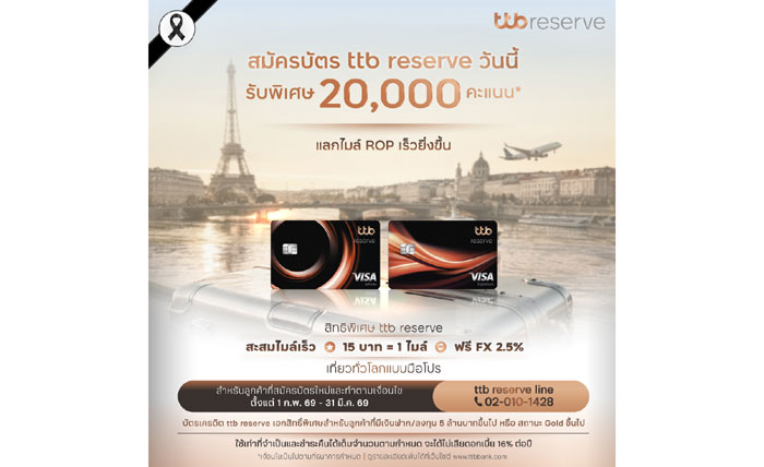 โปรโมชันสุดพิเศษ สำหรับลูกค้าใหม่ที่สมัครบัตรเครดิต ttb reserve วันนี้ รับคะแนนพิเศษ 20,000 คะแนน เพื่อให้ลูกค้าคนสำคัญสามารถสะสมไมล์ ROP ได้เร็วยิ่งขึ้น เมื่อสมัครบัตรใหม่พร้อมมียอดรวมผลิตภัณฑ์ตามที่ธนาคารกำหนดตั้งแต่ 5 ล้านบาทขึ้นไป และคงยอดรวมผลิตภัณฑ์ไม่ต่ำกว่า 5 ล้านบาทต่อเนื่อง 2 เดือน พร้อมมียอดใช้จ่ายสะสมผ่านบัตร 200,000 บาท ภายใน 2 เดือน นับจากเดือนที่อนุมัติบัตร โดยโปรโมชันดังกล่าวมีระยะเวลาตั้งแต่วันที่ 1 กุมภาพันธ์ 2569 – 31 มีนาคม 2569 เท่านั้น