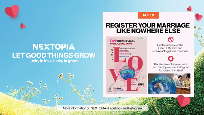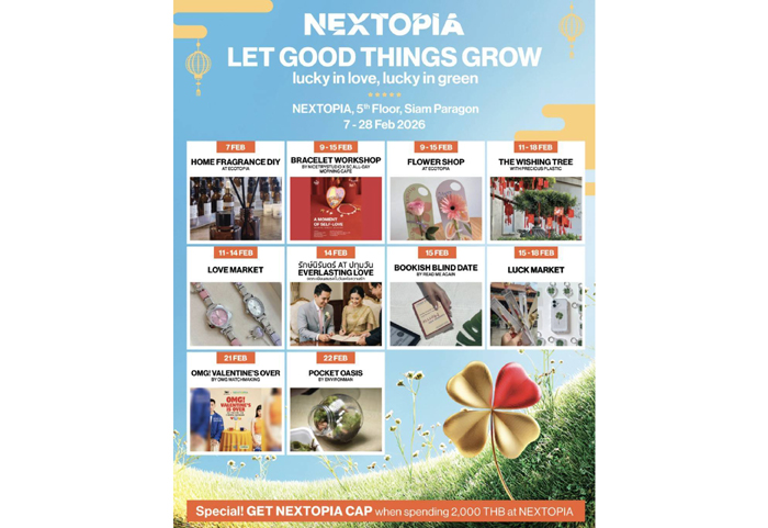 NEXTOPIA เมืองต้นแบบแห่งโลกอนาคต เปิดพื้นที่ต้อนรับวันแห่งความรัก และเทศกาลตรุษจีน ด้วยคอนเซ็ปต์อบอุ่นหัวใจ “Let Good Things Grow : Lucky in Love, Lucky in Green” ระหว่างวันที่ 7-28 กุมภาพันธ์ 2569 ณ NEXTOPIA ชั้น 5 สยามพารากอน ชวนทุกคนมาส่งต่อพลังบวกผ่านการดูแลตัวเอง การเชื่อมโยงกับคนรอบข้าง และการเติบโตไปพร้อมโลกใบนี้ เพราะ “โชคดี” อาจเริ่มต้นจากความใส่ใจเล็ก ๆ ในชีวิตประจำวัน ทั้งความรักในตัวเอง มิตรภาพ ครอบครัว ไปจนถึงความรักที่มีต่อส่วนรวม