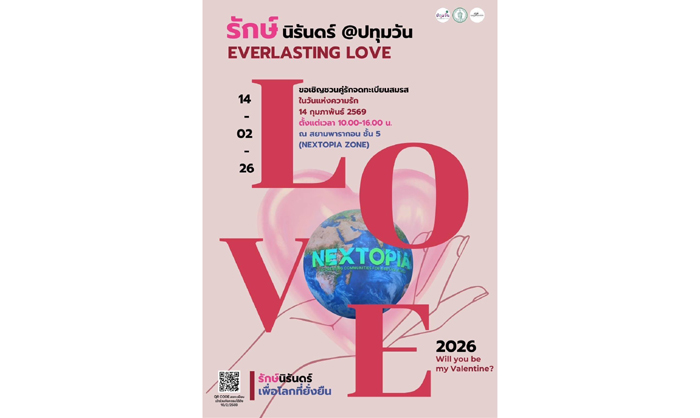 ฉลองวันแห่งความรักใจกลางสยาม ท่ามกลางบรรยากาศสุดพิเศษ ไปกับงาน “Everlasting LOVE รักษ์นิรันดร์@ปทุมวัน” โดย สยามพารากอน, NEXTOPIA, และ สำนักงานเขตปทุมวัน กรุงเทพมหานคร ขอเชิญชวนคู่รัก มาจดทะเบียนสมรสในวันแห่งความรัก ในวันที่ 14 กุมภาพันธ์ 2569 เวลา 10.00-16.00 น และร่วม ขบวนขันหมาสุดสร้างสรรค์บริเวณหน้าพาร์ค พารากอน ในเวลา 10.30 น. ร่วมเป็นส่วน สำคัญ ในการไลฟ์สดขึ้นบน ลูกโลก LED ยักษ์ แลนด์มาร์กระดับไอคอนิกของไทย พร้อมบันทึกภาพความทรงจำในวันสำคัญ ท่ามกลางบรรยากาศ เมืองแห่งโลกอนาคต และยังได้รับของชำร่วยสุดพิเศษจาก สำนักงานเขตปทุมวัน Ecotopia และบัตรรับประทานอาหารฟรีจากร้านดัง อาทิ Fallabella Little Sister Kitchen, Shabu Baru, เตี๋ยวคอปเปอร์ คราฟท์ แทนคำขอบคุณ ในทุกพลังแห่งรักที่ดีต่อคุณและ ดีต่อโลก โดยคู่รักที่ต้องการร่วมโครงการสามารถลงทะเบียนล่วงหน้าได้ที่