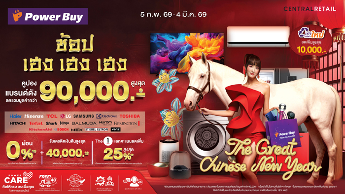 เพาเวอร์บาย ในเครือเซ็นทรัล รีเทล กระตุ้นกำลังซื้อไตรมาสแรก เปิดตัวแคมเปญ เฮง เฮง เฮง “Power Buy The Great Chinese New Year” ต้อนรับเทศกาลตรุษจีน ระหว่างวันนี้ถึง 4 มีนาคม 2569 ช้อปได้ทุกช่องทางที่ เพาเวอร์บายทุกสาขาทั่วประเทศ และช่องทางออนไลน์ หวังตอบโจทย์ผู้บริโภคที่มองหาสินค้าเทคโนโลยี และเครื่องใช้ไฟฟ้าสำหรับครัวเรือนในช่วงเทศกาลสำคัญ จัดหนัก จัดเต็มทั้งโปรโมชั่น สิทธิพิเศษ และกิจกรรมมากมาย อาทิ รับ “เฮงเฮงคูปอง” มูลค่าสูงสุด 90,000 บาท เพื่อใช้เป็นส่วนลดสินค้าแบรนด์ชั้นนำ ได้แก่ Samsung, LG, Haier, Hisense, Electrolux, Toshiba, Hitachi, TCL, Tefal, Shark, Ninja, Balmuda, Hurom, Remington และ KitchenAid, โปรแกรม เก่าแลกใหม่ มอบส่วนลดสูงสุด 10,000 บาท เพิ่มทางเลือกด้านการชำระเงินด้วยโปรโมชั่น ผ่อนชำระ 0% นานสูงสุด 24 เดือน สำหรับสินค้าและบัตรเครดิตที่ร่วมรายการ รวมถึง เครดิตเงินคืนรวมสูงสุด 40,000 บาท และการ แลกคะแนนรับส่วนลดหรือเครดิตเงินคืนสูงสุด 15% พิเศษ…สำหรับสมาชิกบัตรเครดิต Central The 1 มอบ คะแนนสะสมพิเศษ 10 เท่า เมื่อซื้อสินค้าเครื่องฟอกอากาศทุกรุ่น สอดรับกับเทรนด์ผู้บริโภคที่ให้ความสำคัญกับสุขภาพและคุณภาพอากาศภายในที่อยู่อาศัย