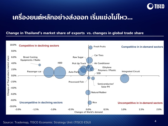 1.‘ภาคการส่งออก’ ที่มีการพูดถึงปัญหามาสักระยะแล้ว โดยสิ่งที่ไทยผลิตได้เก่งเป็นสิ่งที่โลกไม่ได้มีความต้องการมากนักในยุคปัจจุบัน เช่น รถยนต์สันดาป ฮาร์ดดิสไดร์ส ฯลฯ โจทย์สำคัญ คือ ไทยจะเกาะอุตสาหกรรมคลื่นลูกใหม่ไปได้อย่างไร