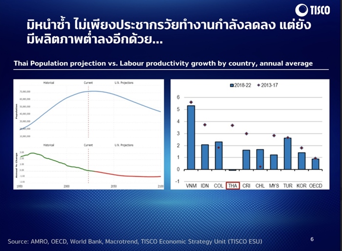 “เราต้องยอมรับถึงศักยภาพการเติบโตของไทยที่มีปัญหา โดยหากย้อนดูในอดีต ก่อนเกิดวิกฤตต้มยำกุ้งไทยมี GDP โต 7.3% แต่ปัจจุบันเหลือเพียง 2.3%คำถาม คือ ปัญหาที่ทำให้ศักยภาพการเติบโตของเศรษฐกิจไทยลดลงมากขนาดนี้มาจากอะไร” เมธัส รัตนซ้อน’ หัวหน้าฝ่ายวิจัยเศรษฐกิจ ศูนย์วิเคราะห์เศรษฐกิจและกลยุทธ์ทิสโก้ (TISCO ESU) กล่าว พร้อมวิเคราะห์ว่า
