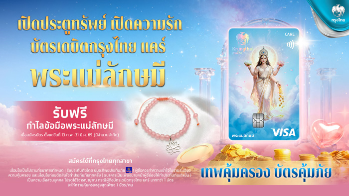 บัตรเดบิตกรุงไทย แคร์ พระแม่ลักษมี ออกแบบหน้าบัตรเป็นภาพองค์พระแม่ลักษมี เทพแห่งความงดงาม ความเจริญรุ่งเรือง และความรัก โดยสื่อถึงความอุดมสมบูรณ์ทั้งทรัพย์สิน โชคลาภ ความสำเร็จ ความรัก และความเมตตา พร้อมมอบทั้งความอุ่นใจจากความคุ้มครอง ควบคู่ความหมายมงคลที่พกพาได้ในทุกวัน ทั้งนี้ สมัครบัตรเดบิต “กรุงไทย แคร์ พระแม่ลักษมี” ตั้งแต่วันนี้ จนถึง 31 มีนาคม 2569 รับฟรี “สร้อยข้อมือสีชมพู พร้อมจี้ดอกบัว สัญลักษณ์ประจำองค์พระแม่ลักษมี” เพื่อเสริมความเป็นสิริมงคล (ของมีจำนวนจำกัด)