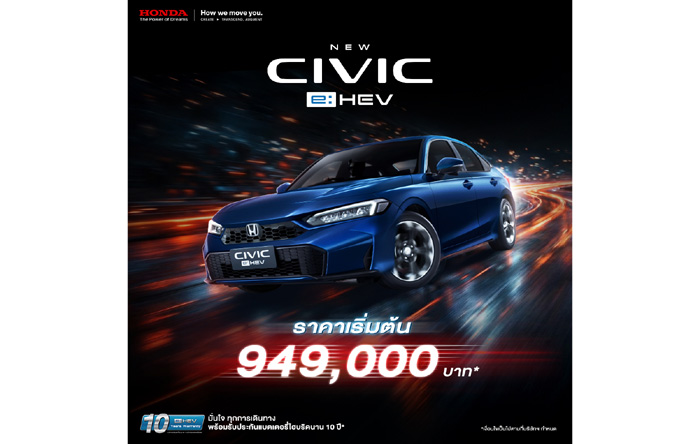 บริษัท ฮอนด้า ออโตโมบิล (ประเทศไทย) จำกัด เดินหน้าเสริมทัพระบบขับเคลื่อนฟูลไฮบริด e:HEV – The EXCITING Hybrid โดยปรับไลน์อัป ฮอนด้า ซีวิค เป็นระบบฟูลไฮบริด e:HEV และสะท้อนความสปอร์ตพรีเมียมกับโลโก้ H Mark ในโทนสีโมโนโครมเงินและดำในทุกรุ่นย่อย พร้อมแนะนำรุ่นย่อยใหม่ e:HEV EL ราคา 949,000 บาท มาพร้อมสิทธิพิเศษ 50,000 บาท* เมื่อจองตั้งแต่วันที่ 17 กุมภาพันธ์ 2569 – 6 เมษายน 2569 และรับรถภายในวันที่ 10 เมษายน 2569 เพื่อให้ลูกค้าได้สัมผัสกับฟูลไฮบริดซีดานที่คุ้มค่าในราคาที่เป็นเจ้าของได้ง่ายขึ้น