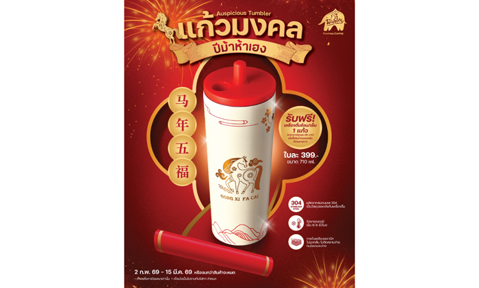 แน่นอนว่า แก้วพรีเมียมคอลเลคชันพิเศษต้องมา พลาดไม่กับ “แก้วมงคล ปีม้าห้าเฮง” แก้วทัมเบลอร์ดีไซน์สวยลายม้าสีทองติดแกลม ขนาด 710 มล. ผลิตจากวัสดุ Food Grade สแตนเลส 304 ภายในเคลือบเซรามิก เก็บอุณหภูมิได้ 6 – 8 ชั่วโมง ในราคาเพียง 399 บาท รับฟรี! เครื่องดื่มร้อนหรือเย็น 1 แก้ว ราคาปกติสูงสุด 65 บาท ตั้งแต่วันที่ 2 ก.พ. 69 – 15 มี.ค. 69 หรือจนกว่าสินค้าจะหมด ที่ร้านกาแฟพันธุ์ไทยทุกสาขาทั่วประเทศ ยกเว้นสาขาสนามบิน