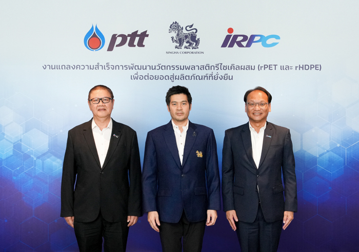 โดยมี คุณปิติ ภิรมย์ภักดี กรรมการรองกรรมการผู้จัดการใหญ่อาวุโส และ ประธานเจ้าหน้าที่บริหาร กลุ่มบริษัทผลิต บริษัท บุญรอดบริวเวอรี่ จำกัด คุณประสงค์ อินทรหนองไผ่ ประธานเจ้าหน้าที่ปฏิบัติการกลุ่มธุรกิจปิโตรเลียมขั้นปลาย บริษัท ปตท. จำกัด (มหาชน) และ คุณเทอดเกียรติ พร้อมมูล ประธานเจ้าหน้าที่บริหารและกรรมการผู้จัดการใหญ่ บริษัท ไออาร์พีซี จำกัด (มหาชน) ร่วมแถลงความสำเร็จการพัฒนานวัตกรรมพลาสติกรีไซเคิลผสม (rPET และ rHDPE) ต่อยอดสู่การสร้างผลิตภัณฑ์ที่ยั่งยืน