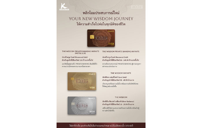เพื่อมอบประสบการณ์บัตรดีไซน์ใหม่ที่ราบรื่น ลูกค้า THE WISDOM จะได้สัมผัสบัตรดีไซน์ใหม่บน K PLUS และสำหรับลูกค้าที่มีสินทรัพย์ตั้งแต่ 30 ล้านบาทขึ้นไป จะได้รับบัตรจริงดีไซน์ใหม่ ซึ่งจะเริ่มจัดส่งและเปิดให้ใช้งานได้ตั้งแต่วันที่ 5 มีนาคม 2569 เป็นต้นไป