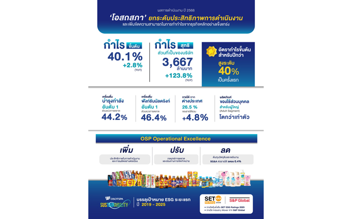นางสาวมุกดา ไพรัชเวทย์ Chief Executive Office บริษัท โอสถสภา จำกัด (มหาชน) หรือ OSP เปิดเผยผลการดำเนินงานในปี 2568 โอสถสภาประสบความสำเร็จในการบริหารจัดการต้นทุนอย่างมีวิสัยทัศน์และปรับสัดส่วนกำลังการผลิตให้มีประสิทธิภาพสูงสุด ส่งผลให้อัตรากำไรขั้นต้นของทุกกลุ่มผลิตภัณฑ์ในประเทศปรับตัวสูงขึ้น โดยมีอัตรากำไรขั้นต้นสูงกว่าระดับ 40% เป็นครั้งแรก ประกอบกับแรงหนุนจากการขยายตัวของสัดส่วนรายได้ในตลาดต่างประเทศซึ่งมีอัตรากําไรขั้นต้นสูงกว่าค่าเฉลี่ย ผลักดันให้บริษัทมีกำไรสุทธิจากการดำเนินงานปกติ 3,503 ล้านบาท เพิ่มขึ้น 15.3% (YoY) นอกจากนี้ บริษัทฯ ยังรับรู้กำไรพิเศษจากการปรับโครงสร้างธุรกิจในไตรมาส 1 ผ่านการจำหน่ายเงินลงทุนในธุรกิจผลิตและจัดจำหน่ายขวดแก้วในประเทศเมียนมา (MGE Group) จำนวน 295 ล้านบาท และมีการบันทึกค่าใช้จ่ายสุทธิจำนวน 130 ล้านบาท เพื่อดำเนินการรวมศูนย์การผลิตในไตรมาส 4 เพื่อยกระดับประสิทธิภาพการดำเนินงานในระยะยาว ส่งผลให้กำไรสุทธิส่วนที่เป็นของบริษัทฯ อยู่ที่ 3,667 ล้านบาท เพิ่มขึ้น 123.8% (YoY)