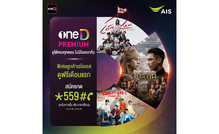 ลูกค้า AIS ทั้งมือถือและเน็ตบ้าน สมัครแพ็กเกจ oneD PREMIUM เพื่อปลดล็อก ดูได้ครบทุกตอน จบในที่เดียว ตั้งแต่วันนี้ – 31 พ.ค. รับสิทธิ์ดูฟรี! เดือนแรก หลังจากนั้น 49 บาท/เดือน สมัครกด *559# โทรออก, หรือเลือกสมัครแบบ รายปี 499 บาท สมัครกด *559*1# โทรออก ดูรายละเอียดเพิ่มเติมได้ที่ https://www.ais.th/oned