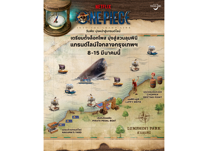 เหล่านากามะโปรดทราบ! Netflix ผสานความร่วมมือกับการท่องเที่ยวแห่งประเทศไทย และกรุงเทพมหานคร จัดใหญ่เอาใจแฟนๆ วันพีซ (One Piece) กับอีเวนต์สุดยิ่งใหญ่ “GRAND LINE IN THAILAND” เปลี่ยนสวนลุมพินีให้กลายเป็นเส้นทางทะเลในตำนานเพื่อต้อนรับการมาของซีรีส์ วันพีซ: มุ่งหน้าสู่แกรนด์ไลน์ ชวนแฟนๆ และผู้ที่ชื่นชอบการผจญภัยมาร่วมกางใบเรือมุ่งสู่แกรนด์ไลน์ด้วยกัน พร้อมโอกาสพิเศษสัมผัสประสบการณ์ล่องเรือโจรสลัดในโลกแห่งวันพีซอย่างที่ไม่เคยมีมาก่อน