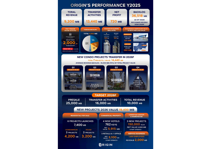 ทั้งนี้ ORIGIN ประกาศทิศทางการดำเนินธุรกิจ ปี 2569 ภายใต้กลยุทธ์ “ORIGIN Portfolio Evolution 2026 วิวัฒนาการพอร์ตธุรกิจ สู่การเติบโตอย่างยั่งยืน” เพื่อสร้างความมั่นคงและพร้อมรับมือกับความเปลี่ยนแปลง ขับเคลื่อนธุรกิจให้เติบโตในทุกมิติ ตั้งเป้ายอดขาย 25,000 ล้านบาท และรายได้รวม 10,000 ล้านบาท วางแผนเปิดตัวโครงการใหม่มูลค่ารวมทั้งหมด 19,400 ล้านบาท ประกอบไปด้วย คอนโด ORIGIN VERTICAL และ บ้าน BRITANIA รวม 6 โครงการ มูลค่ารวม 7,400 ล้านบาท ธุรกิจโรงแรม 4 โรงแรม มูลค่ารวม 5,900 ล้านบาท* ธุรกิจอาคารสำนักงานและพื้นที่เชิงพาณิชย์ ที่จะเริ่มเปิดดำเนินการได้รวม 4 แห่ง มูลค่ารวม 3,100 ล้านบาท* และธุรกิจคลังสินค้าและโรงงานที่จะพร้อมให้เช่าอีก 5 โครงการ กว่า 150,000 ตารางเมตร มูลค่ารวม 3,000 ล้านบาท* บริษัทฯมั่นใจผลการดำเนินงานทั้งปีเป็นไปตามกลยุทธ์ที่วางไว้ พร้อมกันนี้ยังมีแผนที่จะทำ Origin Vacation Club เพื่อเพิ่มมูลค่าและประสบการณ์การอยู่อาศัยให้กับลูกค้าของ ORIGIN VERTICAL และ BRITANIA ในโครงการหรือในทำเลต่างๆ โดยมี HHR เป็นผู้ดูแล ตามแผนสร้างการเติบโตและการดูแลผู้บริโภคแบบไม่สิ้นสุด