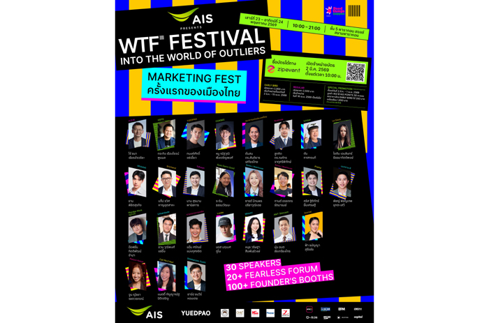 AIS ร่วมกับ HOW x Goodthings Happen แถลงข่าวเปิดตัวโปรเจกต์ใหญ่ “AIS PRESENTS WTF Festival 2026: Into the World of Outliers” เตรียมสร้าง “พื้นที่แห่งอนาคต” ที่ไม่ใช่เพียงอีเวนต์ธุรกิจ แต่คือเวทีทางความคิดและการเชื่อมต่อของ Community แห่ง Wisdom (คอมมูนิตี้แห่งภูมิปัญหา) สำหรับคนที่กล้าคิดต่าง กล้าทดลอง และกล้ายืนบนเส้นทางของตัวเอง เพื่อเสริมศักยภาพคนไทยและธุรกิจไทย ให้เติบโตได้จริงในโลกยุคใหม่ และต่อยอดไปสู่การพัฒนาประเทศในระยะยาว โดยงานนี้จัดเต็ม 2 วัน ระหว่างวันที่ 23 – 24 พ.ค. 2569 ณ ชั้น 5 พารากอน ฮอลล์ สยามพารากอน ผ่าน 3 โซนหลัก ได้แก่