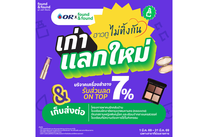 บริษัท ปตท. น้ำมันและการค้าปลีก จำกัด (มหาชน)(OR) สานต่อพลังแห่งการแบ่งปันผ่านโครงการ “ฮาวทูไม่ทิ้งกัน” ต่อเนื่องเป็นปีที่ 2 โดยในเดือนมีนาคม 2569 นี้ ซึ่งตรงกับ วันสตรีสากล (8 มีนาคม) ได้ร่วมกับร้าน found & found เปิดรับบริจาคเครื่องสำอางและอุปกรณ์แต่งหน้าที่ไม่ได้ใช้แล้ว เพื่อนำไปสร้างประโยชน์และเติมเต็มโอกาสให้แก่ผู้ที่ขาดแคลนในหน่วยงานต่าง ๆ ทั่วประเทศ