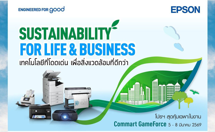 เอปสันร่วมออกบูธในงาน Commart GameForce 2026 ยกทัพผลิตภัณฑ์หลากหลายกลุ่ม ทั้งเครื่องพิมพ์ Epson EcoTank เครื่องพิมพ์สำหรับองค์กร โปรเจคเตอร์ สแกนเนอร์ เครื่องพิมพ์หน้ากว้าง และเครื่องพิมพ์ฉลาก พร้อมนำเสนอเทคโนโลยีภายใต้แนวคิด “Sustainability for Life & Business” ที่มุ่งพัฒนานวัตกรรมที่ช่วยเพิ่มประสิทธิภาพการใช้งาน ควบคู่กับการลดผลกระทบต่อสิ่งแวดล้อม