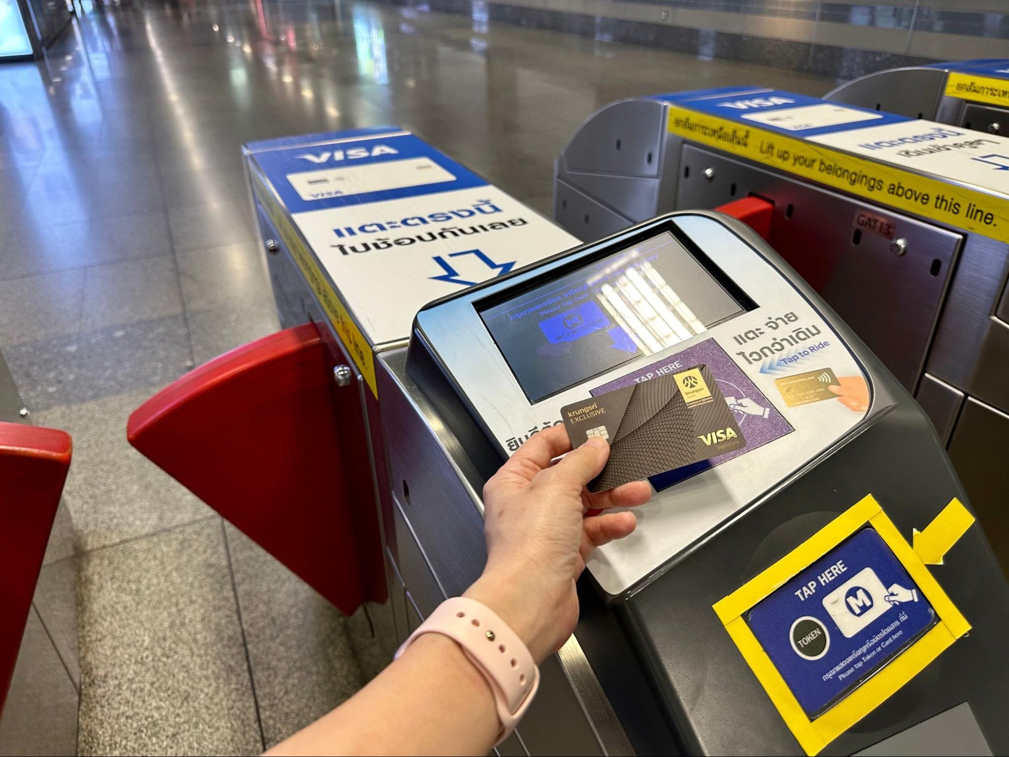 ไม่ต้องต่อคิวซื้อเหรียญ เพียงใช้บัตรเครดิต เดบิต หรือพรีเพดที่มีสัญลักษณ์ Contactless ))) ก็แตะเข้า–ออกได้ทันที