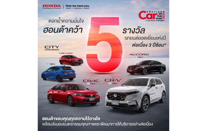 บริษัท ฮอนด้า ออโตโมบิล (ประเทศไทย) จำกัด เดินหน้าก้าวเข้าสู่ปี 2569 ตอกย้ำความเชื่อมั่นจากลูกค้าชาวไทย ด้วยการคว้า 5 รางวัล รถยอดเยี่ยมแห่งปี ในงาน Car of the Year 2026 จัดโดย บริษัท กรังด์ปรีซ์ อินเตอร์เนชั่นแนล จำกัด (มหาชน) ความสำเร็จในครั้งนี้ ถือเป็นบทพิสูจน์ถึงความแข็งแกร่งของไลน์อัปผลิตภัณฑ์ฟูลไฮบริด e:HEV – The EXCITING Hybrid ที่มอบประสบการณ์ขับขี่ที่สนุก เร้าใจ และอัตราประหยัดน้ำมันที่ดีเยี่ยม โดยรถยนต์ฮอนด้าที่ได้รับรางวัลรถยอดเยี่ยมแห่งปีครอบคลุมทั้งกลุ่มรถยนต์ซีดาน แฮทช์แบ็ก และเอสยูวี ได้แก่