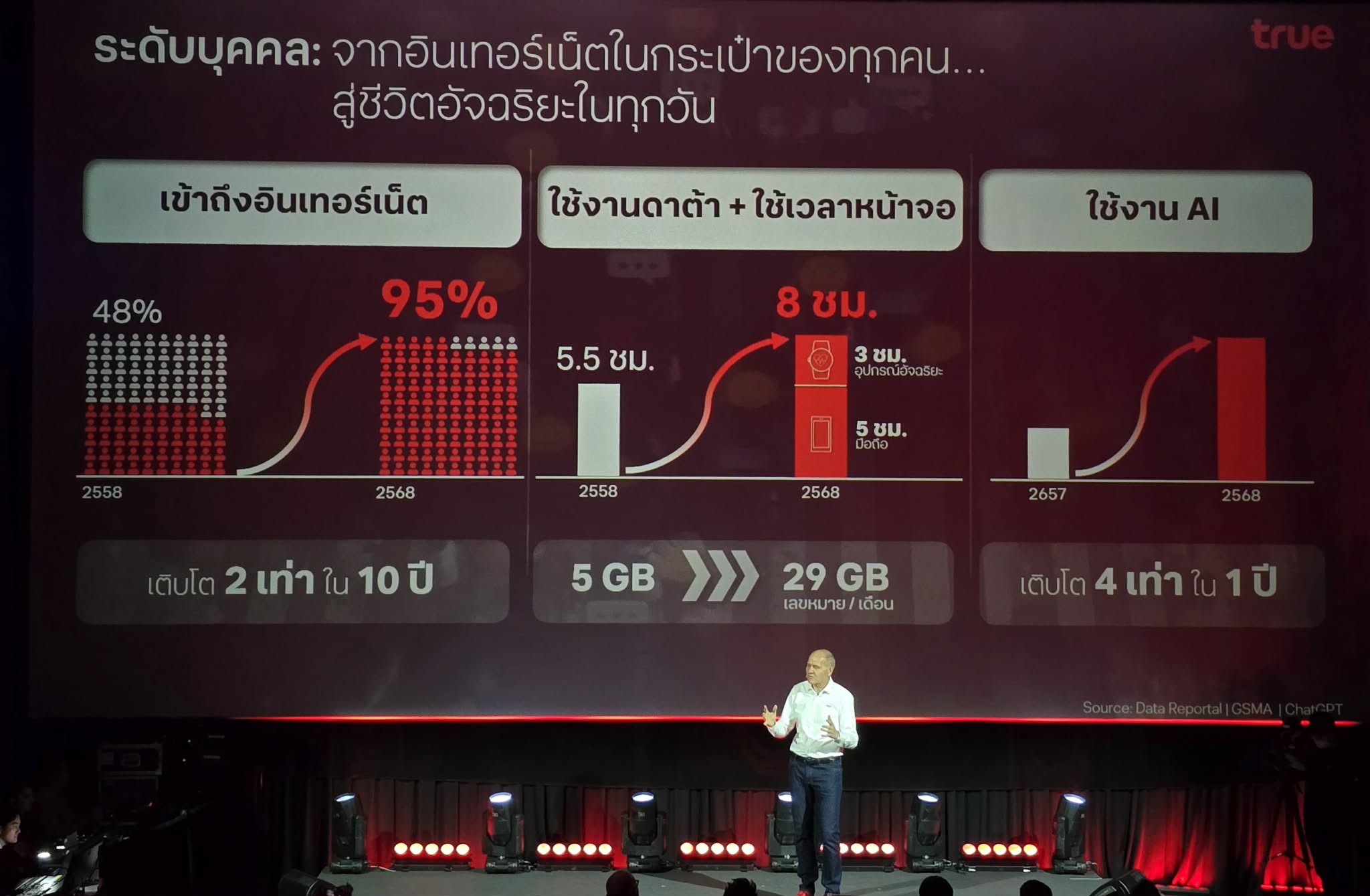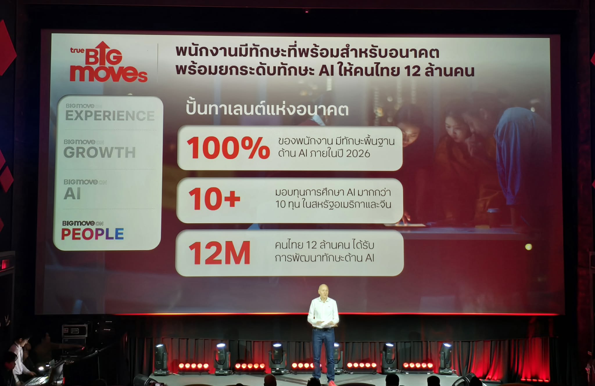 - AI-First: AI ไม่ใช่แค่เทรนด์ แต่คือหัวใจของทุกสิ่งที่วางแผนไว้ อาทิ AI สำหรับการทำงานภายใน ทุกกระบวนการที่ย้ายขึ้นคลาวด์ได้จะถูกย้าย และงานรูทีนที่กินเวลาพนักงานโดยไม่จำเป็นจะถูก AI จัดการแทน การใช้ AI เพื่อให้บริการแบบ Hyper-personalization ที่ส่งข้อเสนอที่ใช่ให้คนที่ถูกต้อง ในเวลาที่เหมาะสม โดย True มีเป้าหมายในการพัฒนา พนักงานทั้ง 10,000 คน ต้องมีความรู้ด้าน AI ภายในปีนี้ โดย 60% ต้องมีพื้นฐานที่แน่น 20% เป็นผู้ใช้ระดับสูง และ 10% คือ ผู้เชี่ยวชาญระดับผู้เชี่ยวชาญ นอกจากนี้ True วางแผนเพิ่มขีดสามารถ AI ให้คนไทย 12 ล้านคนด้วย