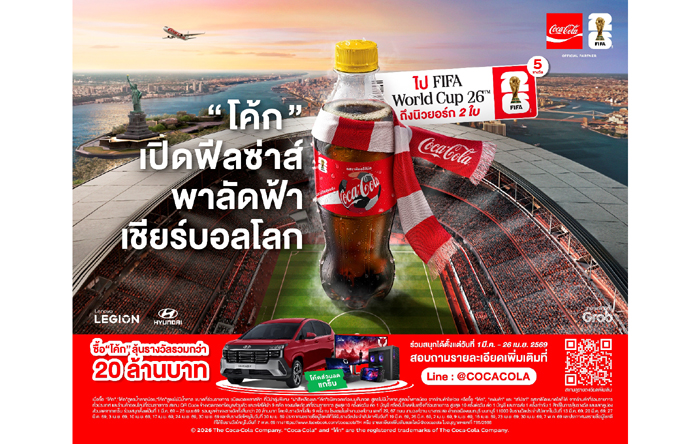 เพื่อเป็นการเฉลิมฉลองมหกรรมลูกหนังที่ยิ่งใหญ่ที่สุดในโลก โคคา-โคล่า ในฐานะพันธมิตรอย่างเป็นทางการของ FIFA ได้เตรียมรางวัลใหญ่สุดเอ็กซ์คลูซีฟที่จะทำให้ทุกคนต้องร้องว้าว กับ แพ็กเกจร่วมชมการแข่งขันฟุตบอลโลก FIFA World Cup 2026 จำนวน 5 รางวัล (รางวัลละ 2 ที่นั่ง) มูลค่ารางวัลละ 420,000 บาท รวมมูลค่า 2.1 ล้านบาท ที่จะพาผู้โชคดีบินลัดฟ้าสู่นิวยอร์ก พร้อมตั๋วเครื่องบินไป-กลับ ที่พัก อาหาร และการดูแลอย่างเหนือระดับตลอดทริป 4 วัน 3 คืน เพื่อให้แฟนบอลชาวไทยได้สัมผัสบรรยากาศความยิ่งใหญ่ของการแข่งขันฟุตบอลโลก FIFA World Cup 26™ ติดขอบสนามจริงครั้งหนึ่งในชีวิต