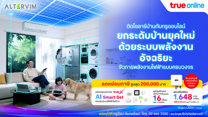 ท่ามกลางแนวโน้มค่าไฟที่เพิ่มสูงขึ้นและความต้องการใช้พลังงานในครัวเรือนที่พุ่งสูงขึ้นอย่างต่อเนื่อง ทรูออนไลน์ ผู้นำนวัตกรรมเน็ตบ้านไฟเบอร์อันดับ 1 และ Smart Home Connectivity – เดินหน้าพลิกโฉมที่อยู่อาศัยสู่ Solar Smart Home แบบครบวงจร ประกาศความร่วมมือเชิงกลยุทธ์กับ Altervim ผู้เชี่ยวชาญด้านพลังงานสะอาดชั้นนำ ด้วยประสบการณ์ติดตั้งระบบโซลาร์มากกว่า 3,500 โครงการทั่วประเทศเปิดตัวโซลูชันโซลาร์บ้านที่ผสาน AI Smart Set และระบบ Smart Home เข้าด้วยกัน ภายใต้แนวคิด “ติดโซลาร์กับทรูออนไลน์ ยกระดับบ้านยุคใหม่ด้วยพลังงานอัจฉริยะ” ช่วยให้เจ้าของบ้านสามารถผลิตไฟฟ้าจากพลังงานแสงอาทิตย์ ควบคู่กับการติดตาม วิเคราะห์ และบริหารจัดการการใช้พลังงานทั้งบ้านแบบเรียลไทม์ได้อย่างชาญฉลาด ผ่านแอป TrueX เพียงแอปเดียว พร้อมสิทธิพิเศษส่วนลด เน็ตบ้านทรูออนไลน์ 500 บาทต่อเดือน นานสูงสุด 16 เดือน ยกระดับมาตรฐานใหม่ของการใช้ชีวิตในบ้านอัจฉริยะยุคดิจิทัล