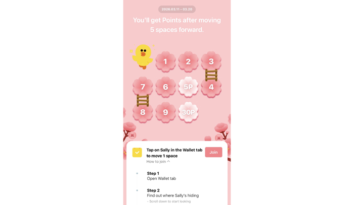 มาร่วมสนุก 10 วันเต็ม กับภารกิจตามหาแซลลี่: ต้อนรับซากุระบาน ฤดูกาลรับพอยท์ ตั้งแต่วันที่ 11–20 มีนาคม 2569 ผู้ใช้งานสามารถเข้าร่วมผจญภัยเพื่อตามหา Sally ในแท็บ Wallet ต่อเนื่องได้ทุกวัน เพื่อรับรางวัลรวมสูงสุด 35 LINE POINTS เพียงทำตามขั้นตอน ดังนี้