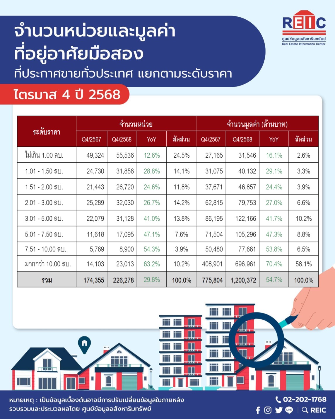 ตลาด “บ้านมือสอง” กำลังร้อนแรงกว่าที่หลายคนคิด ข้อมูลจาก ศูนย์ข้อมูลอสังหาริมทรัพย์ (REIC) ระบุว่า ณ ไตรมาส 4 ปี 2568 จำนวนบ้านมือสองประกาศขายทั่วประเทศเพิ่มขึ้นอย่างมีนัยสำคัญ